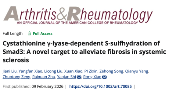 近日,中南大学湘雅二医院皮肤性病科肖嵘教授团队在美国风湿病学会官方期刊《关节炎与风湿病学》(Arthritis & Rheumatology)(IF 10.9)上发表题为《胱硫醚γ-裂解酶依赖的Smad3硫巯基化:系统性硬化症纤维化的新型治疗靶点》(《Cystathionine γ-lyase-dependent S-sulfhydration of Smad3: A novel target to alleviate fibrosis in systemic sclerosis》)的原创性研究成果,为系统性硬化症的靶向治疗提供新的理论依据和潜在干预策略。