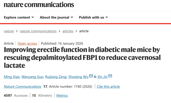 近日,中南大学湘雅二医院金鑫教授团队在糖尿病性勃起功能障碍(Diabetes-mediated Erectile Dysfunction, DMED)发病机制及精准干预领域取得重要进展,相关成果发表在国际著名期刊《Nature Communications》(中科院一区Top期刊,IF=15.7)上。研究以“Fbp1介导海绵体乳酸蓄积在糖尿病性勃起功能障碍中的机制及干预研究”为题,系统揭示DMED中海绵体乳酸异常蓄积的分子机制,并提出基于Fbp1靶点的mRNA治疗新策略。