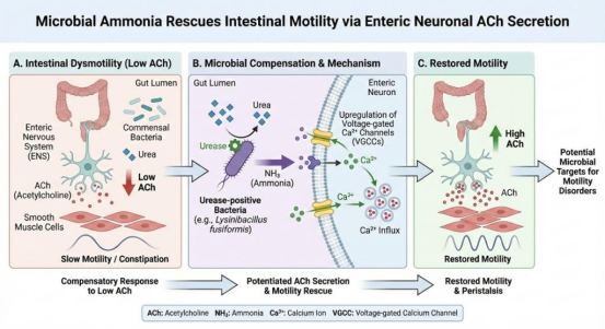 该研究首次提出肠道微生物可通过代谢补偿机制感知宿主神经递质变化,并以氨为信号分子维持肠道动力稳态,为便秘等肠道动力障碍的微生态干预提供了潜在新靶点,具有重要的基础研究价值和转化应用前景。