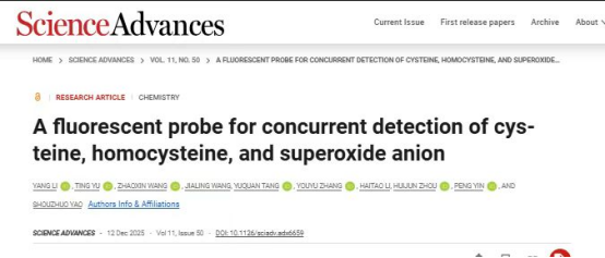 近日,由湘雅医学院附属肿瘤医院消化泌尿内一科周慧俊教授和湖南师范大学化学化工学院尹鹏教授作为共同通讯作者,在国际著名学术期刊《Science Advances》(中科院一区TOP期刊,2024IF=12.5)发表了题为“A fluorescent probe for concurrent detection of cysteine, homocysteine, and superoxide anion(多功能荧光探针用于同时检测Cys、Hcy和超氧阴离子:揭示其在肿瘤氧化应激与铁死亡中的潜在应用)”的原创性研究论文。