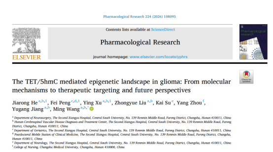 近日,中南大学湘雅二医院神经外科王明团队在国际期刊《Pharmacological Research》(IF:10.5)发表题为“The TET/5hmC mediated epigenetic landscape in glioma: From molecular mechanisms to therapeutic targeting and future perspectives”的综述文章。该文围绕胶质瘤中TET酶及5-羟甲基胞嘧啶(5hmC)异常失衡这一关键表观遗传事件,系统梳理了其分子机制、功能影响及潜在干预策略。文章指出,胶质瘤尤其是胶质母细胞瘤中普遍存在5hmC整体下降和TET功能受损,TET1核排斥、TET2/TET3核内丰度下降与肿瘤恶性进展密切相关;同时,低TET2表达和低5hmC水平提示较差预后,而高TET3表达则与相对更好的临床结局相关。团队还总结了miRNA拮抗剂、维生素C、DNMT/HDAC抑制剂、CRISPR-dCas9表观编辑、脑穿透性IDH抑制剂等潜在治疗方向,并提出需进一步加强单细胞、空间组学和生物标志物研究。该成果为深入理解胶质瘤表观遗传异常及推进精准治疗提供了新的理论依据。