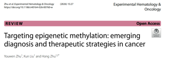 近日,中南大学湘雅医院肿瘤学教研室、肿瘤放疗科朱红教授团队在国际知名学术期刊《Experimental Hematology & Oncology(实验血液学与肿瘤学)》(JCR Q1,IF: 13.5)上发表了题为“Targeting epigenetic methylation: emerging diagnosis and therapeutic strategies in cancer”(靶向表观遗传甲基化:癌症的新兴诊断及治疗策略)的重要综述论文。