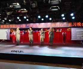 我院于11月20日晚7点,在湘雅校区十二食堂二楼学生活动中心举行了以“征途漫漫、医路同心”为主题的湘雅医学院2014级见习晚会。晚会通过革命现代舞、舞台剧、乐器大合奏等形式展现了湘雅医学生的不怕吃苦,斗志昂扬的精神面貌,学生表示要向老一辈无产阶级革命家学习,进一步贯彻党的群众路线的自觉性和坚定性,在以后的学习和生活中会一直弘扬长征精神,在各方面起到先锋模范作用。