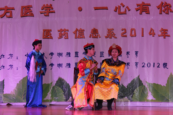 “一曲惊鸿似梦中”,上篇的表演从《甄嬛外传》的惊鸿舞开始,用大家熟知的电视剧作载体,以反串歌舞剧的形式,将医药信息系学长学姐的热情与欢乐传递给14级新生。台下笑声不断,首个节目就将晚会气氛推向了一个小高潮。